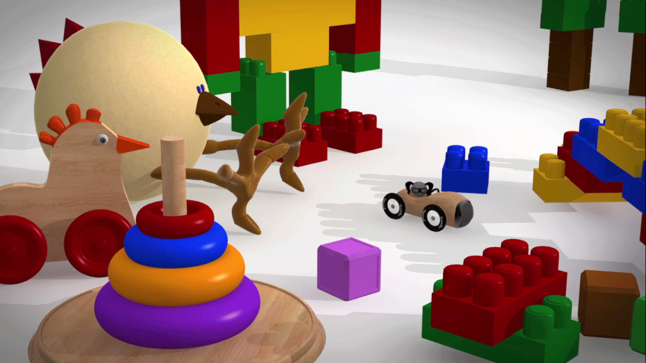 Modélisation et Animation d'une voiture en bois vilac dans un décor fait de jouets.